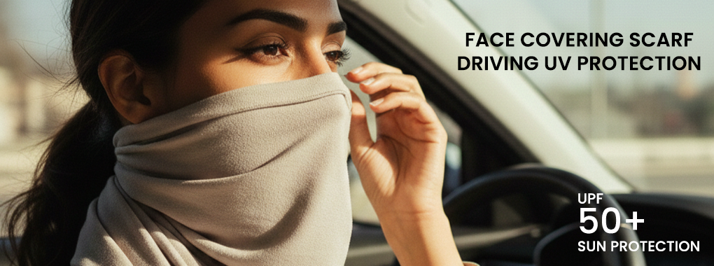 A face covering scarf is a double shield. It blocks UV radiation as well as physically filtering out particles and dust and keeps your pores clear and your skin protected.